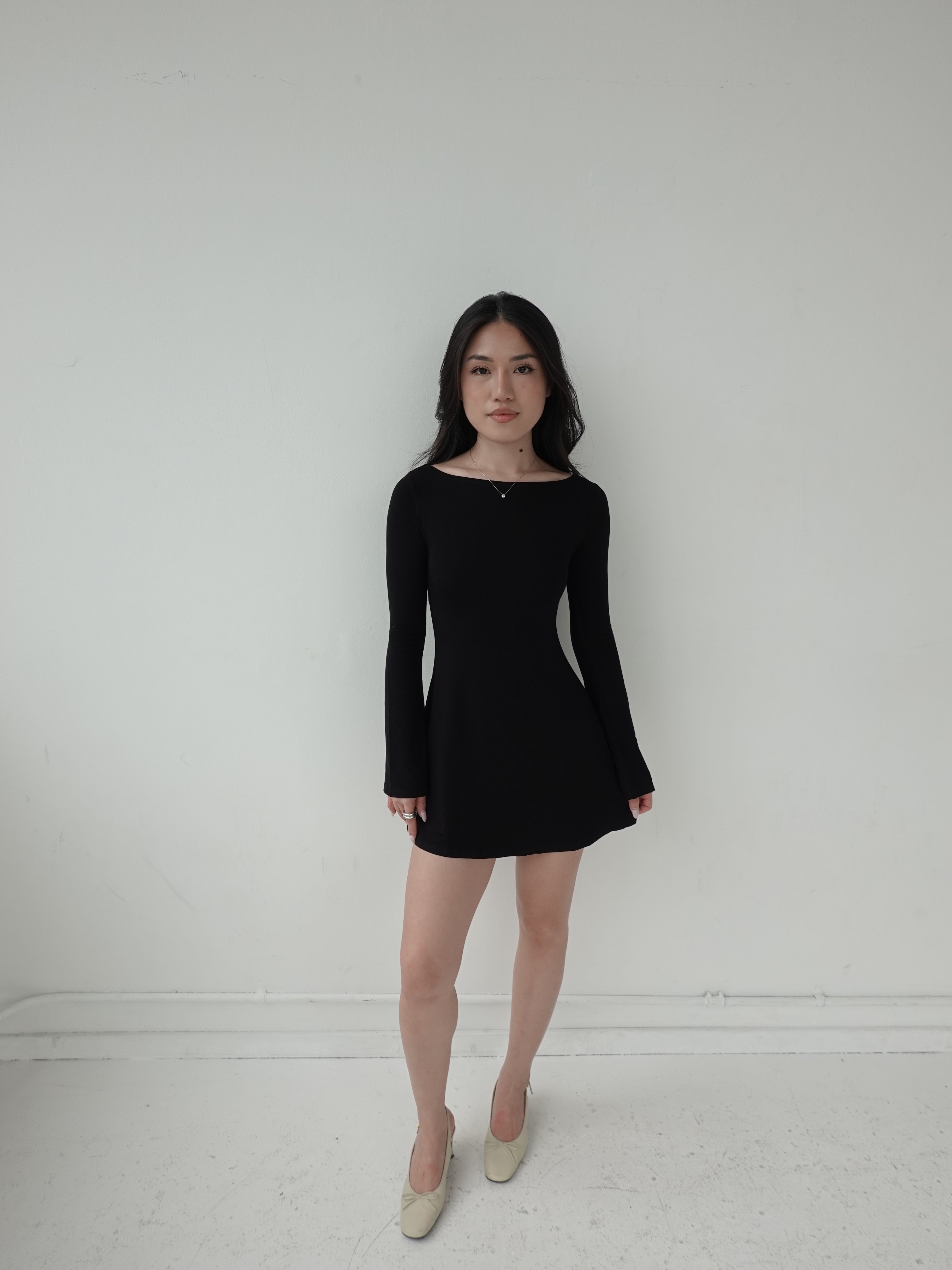 LAYLA Long Sleeve Boat Neck Mini Dress - Jet Black