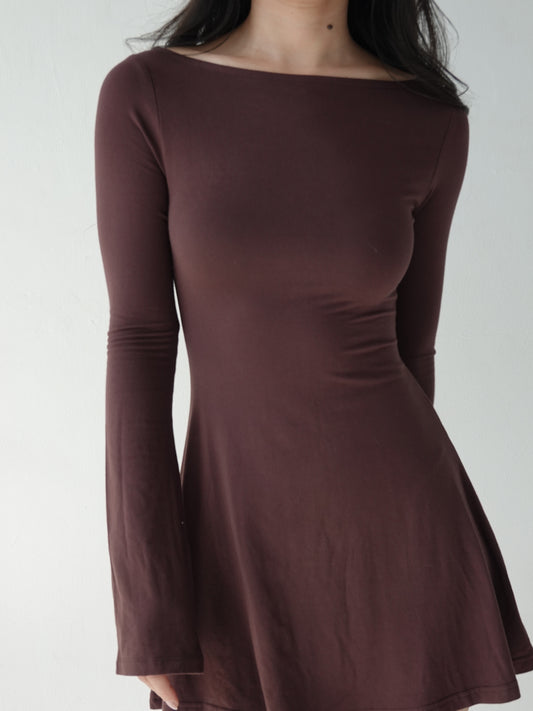 Long Sleeve Boat Neck Micro Mini Dress - Espresso